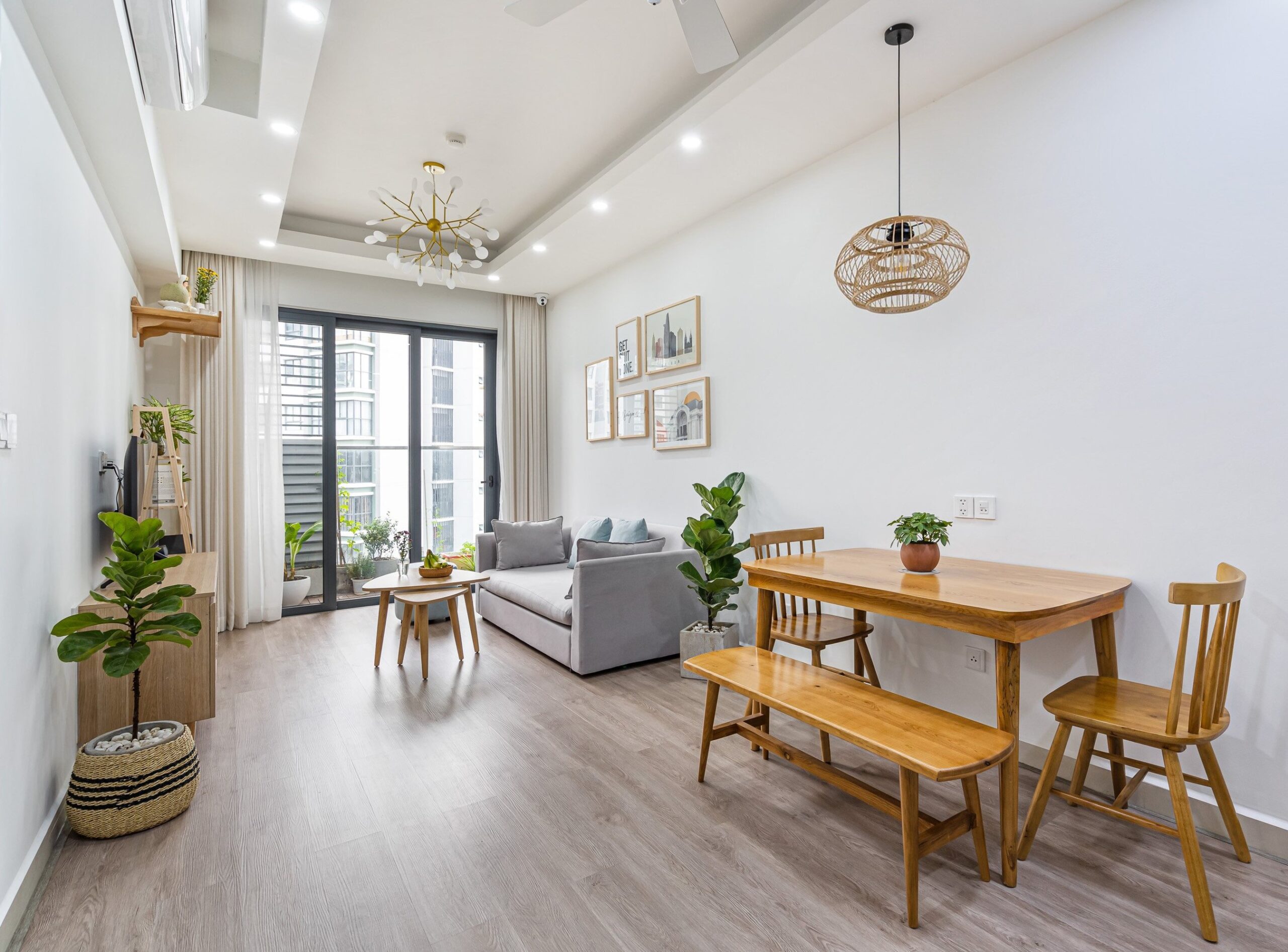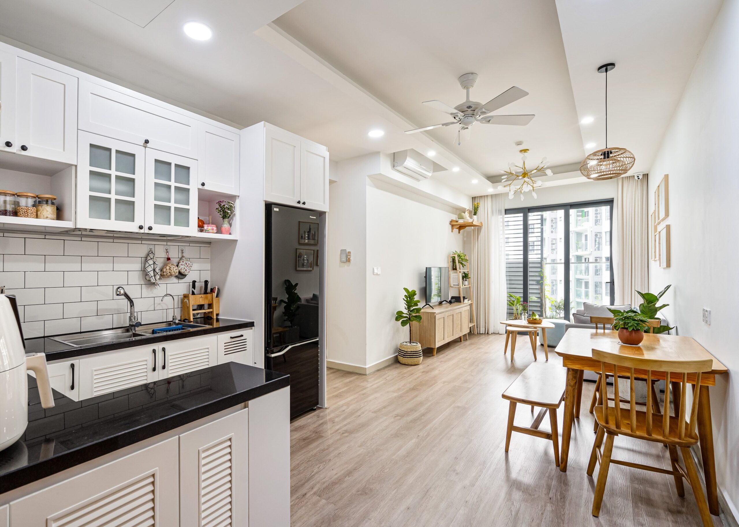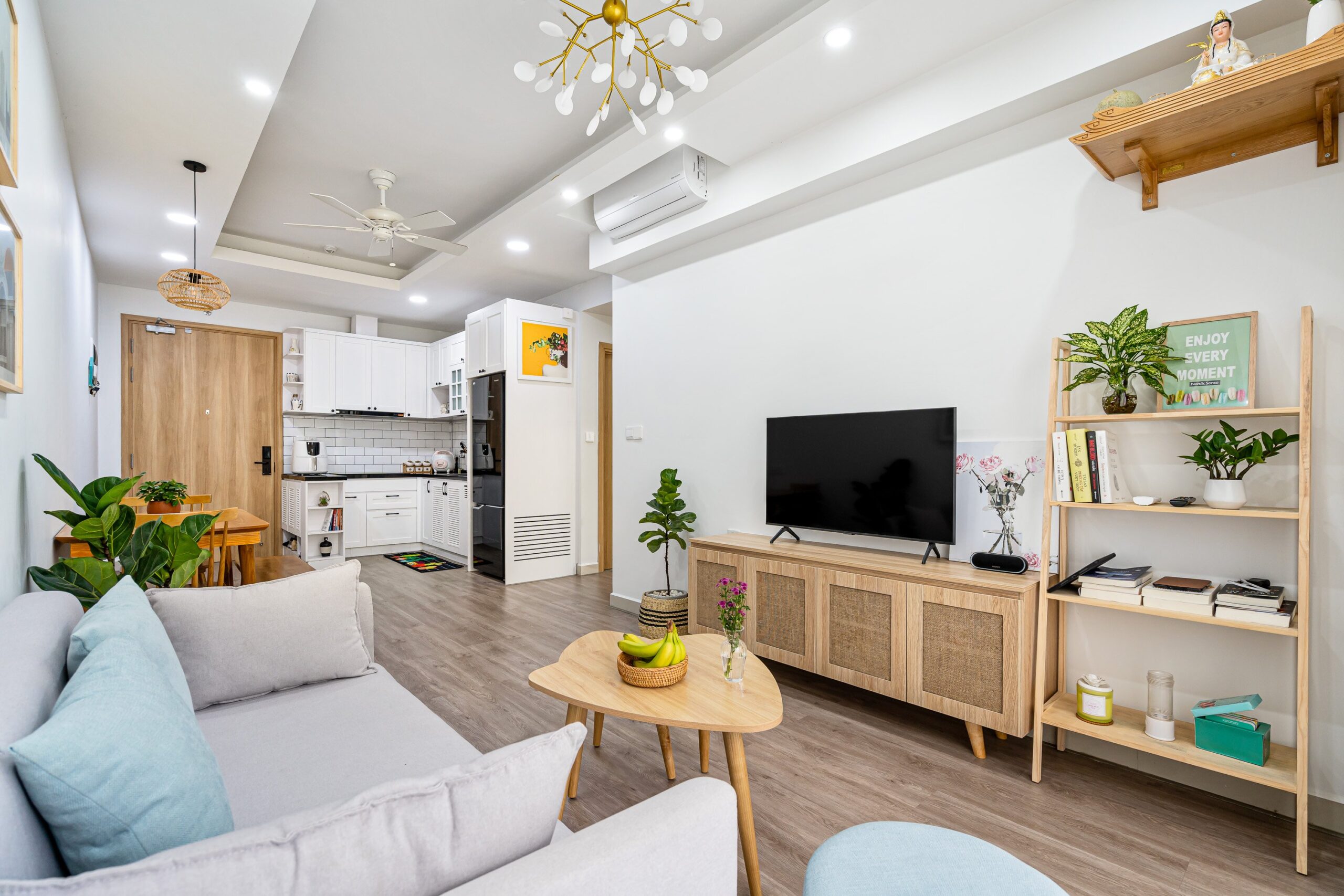 Tông màu trang nhã và nội thất gỗ tự nhiên giúp tổng thể căn hộ ấm áp nhưng vẫn hiện đại và trẻ trung.