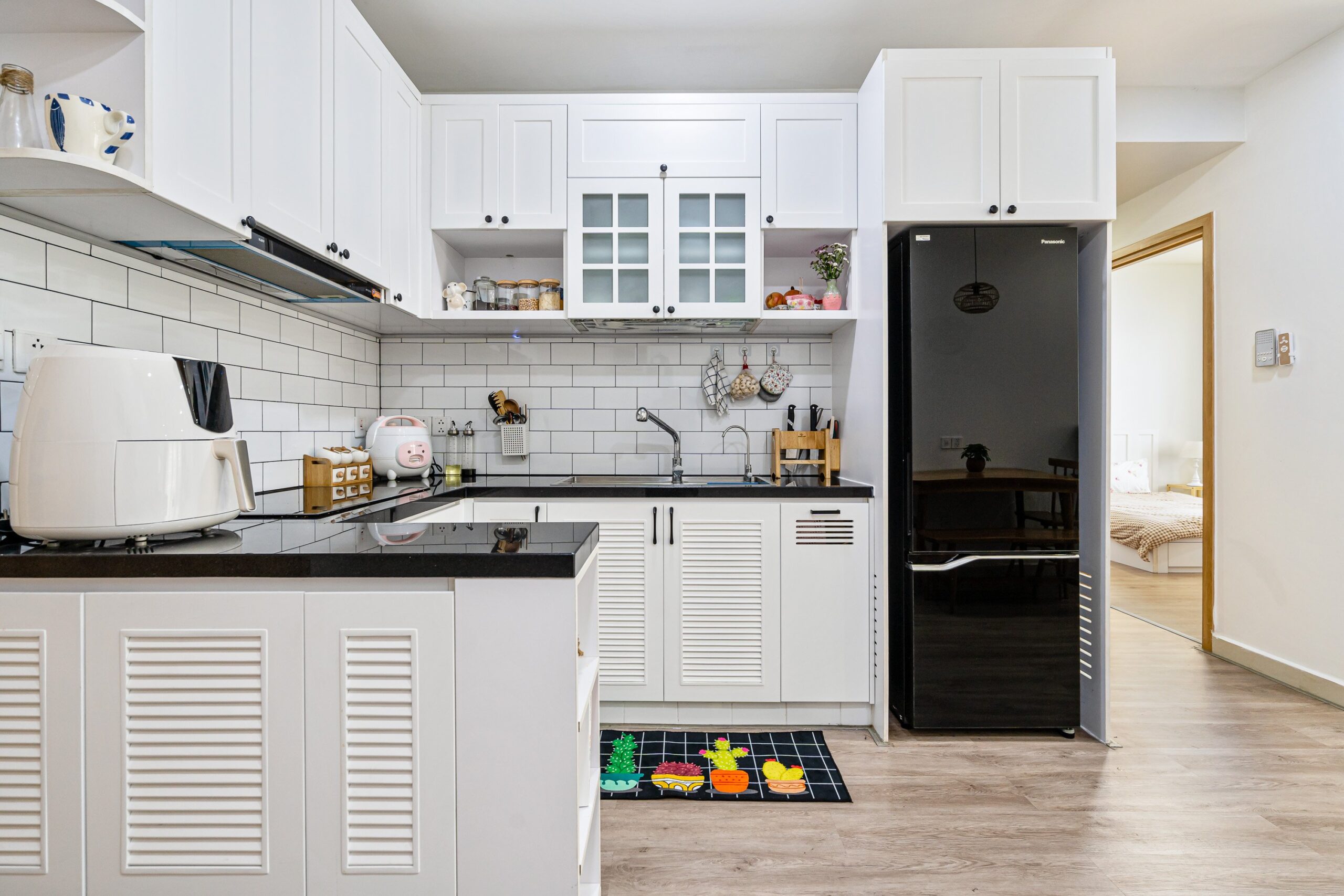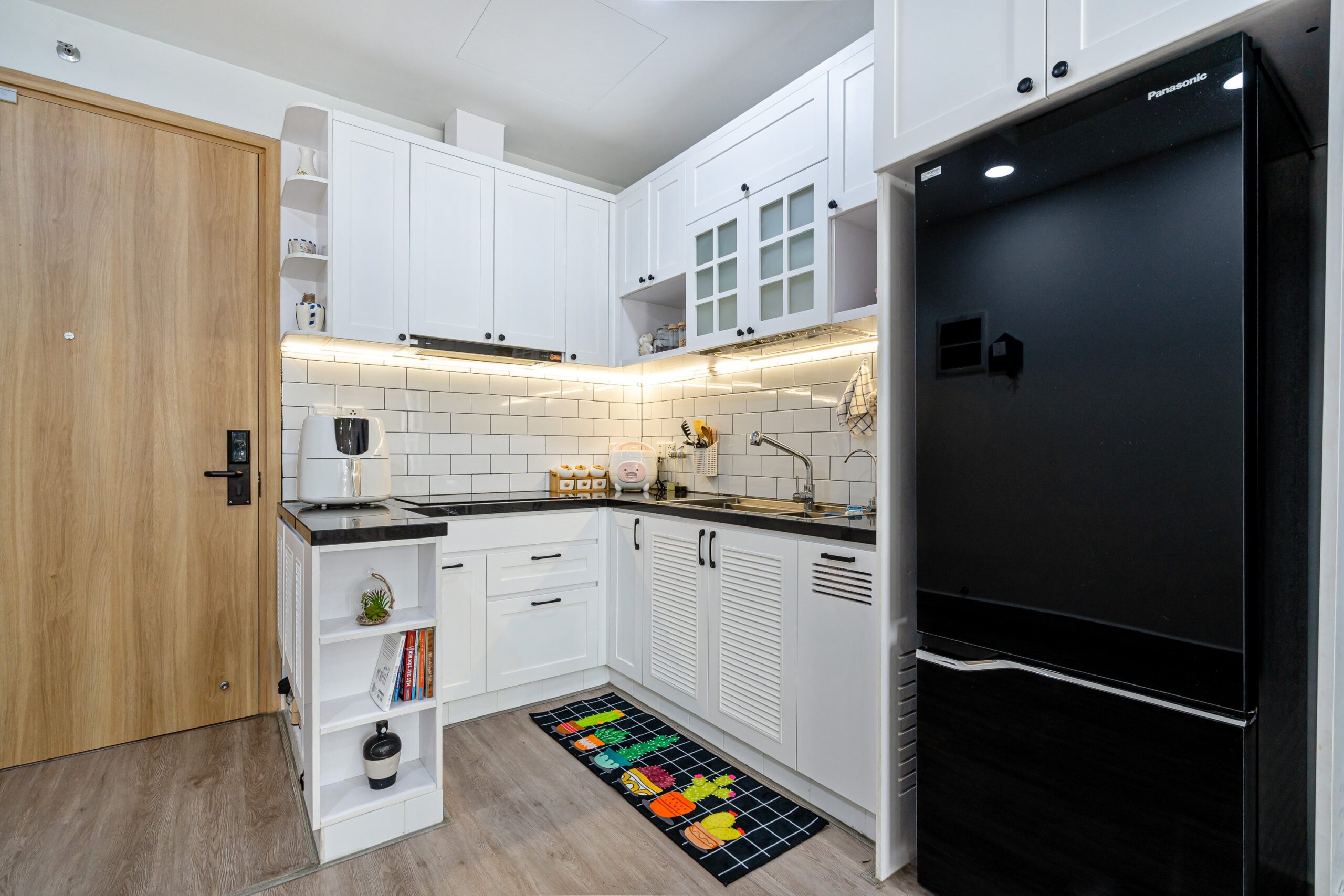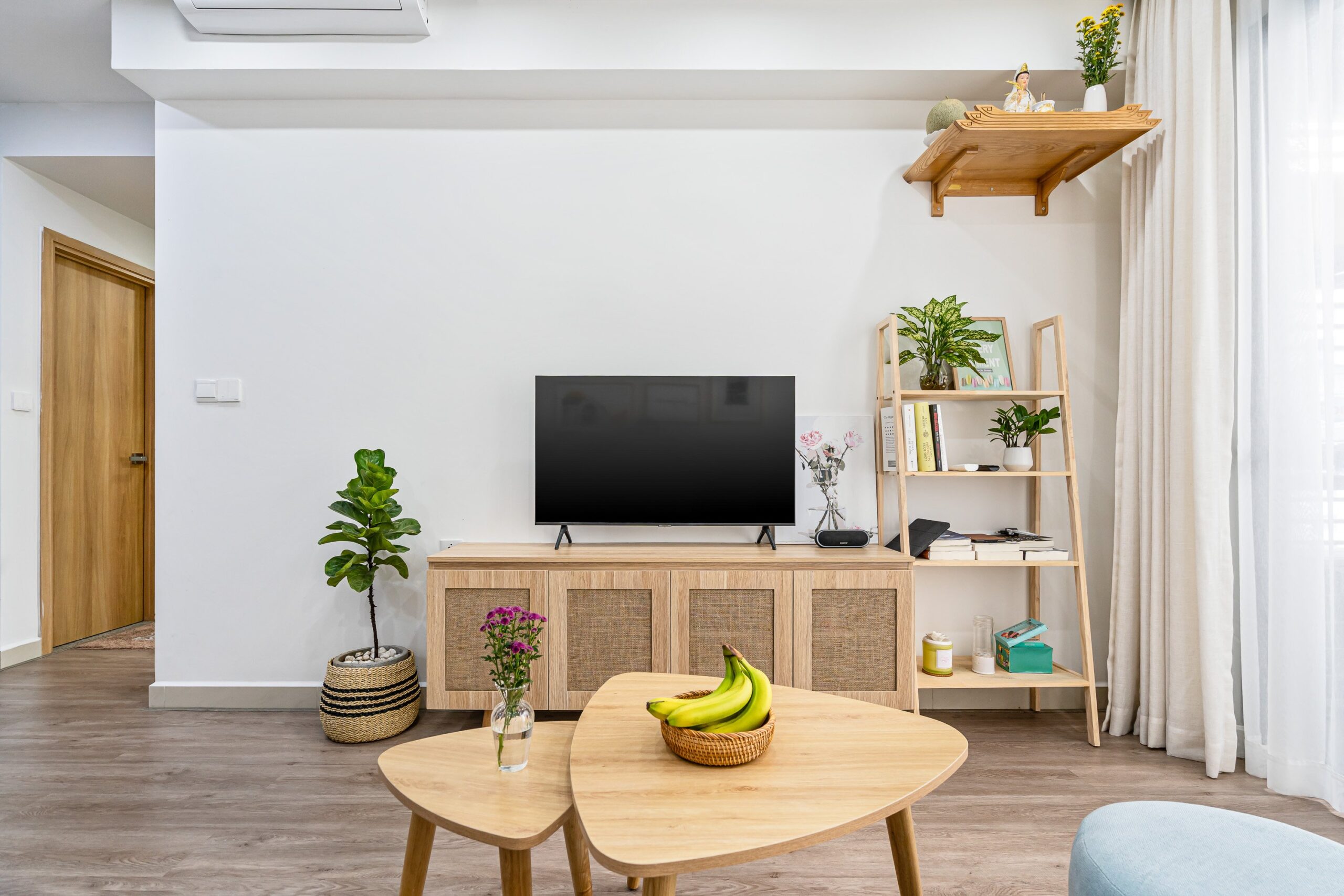 Tông màu trang nhã và nội thất gỗ tự nhiên giúp tổng thể căn hộ ấm áp nhưng vẫn hiện đại và trẻ trung.