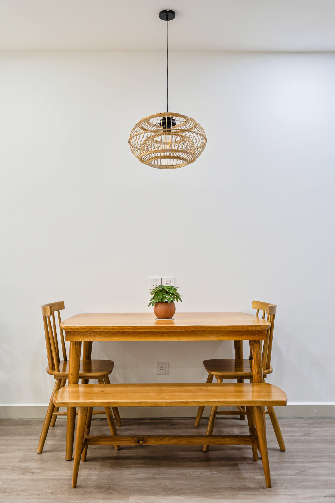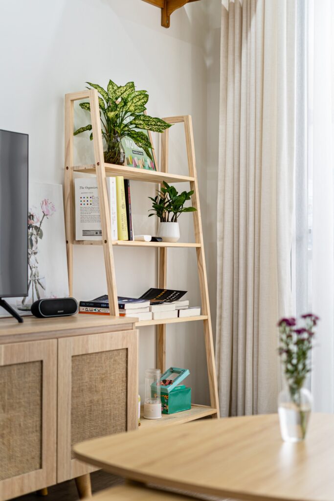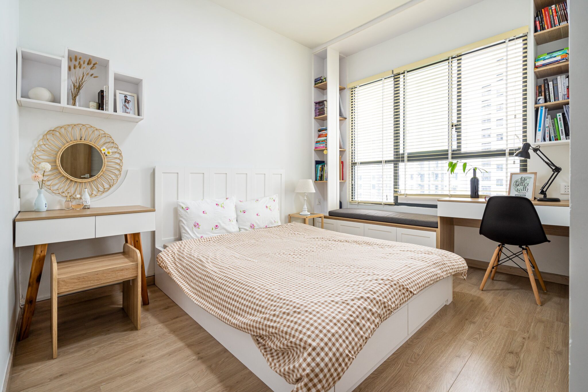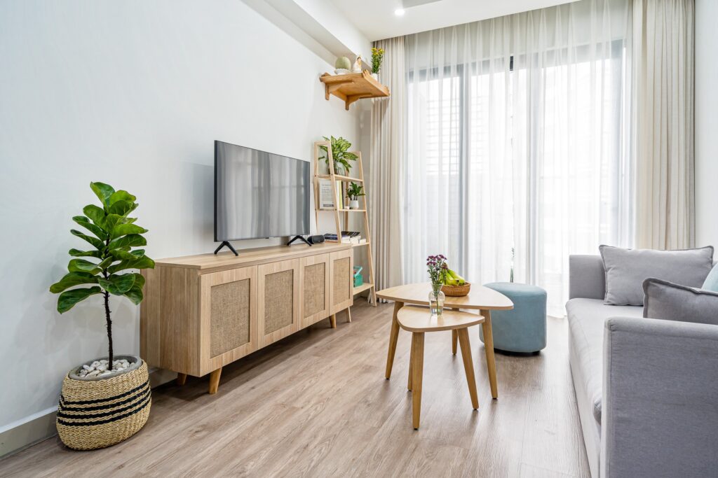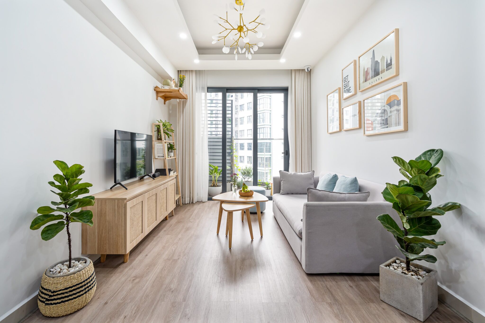 Tông màu trang nhã và nội thất gỗ tự nhiên giúp tổng thể căn hộ ấm áp nhưng vẫn hiện đại và trẻ trung.