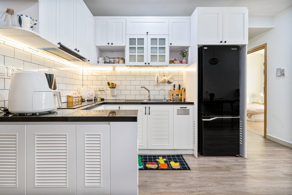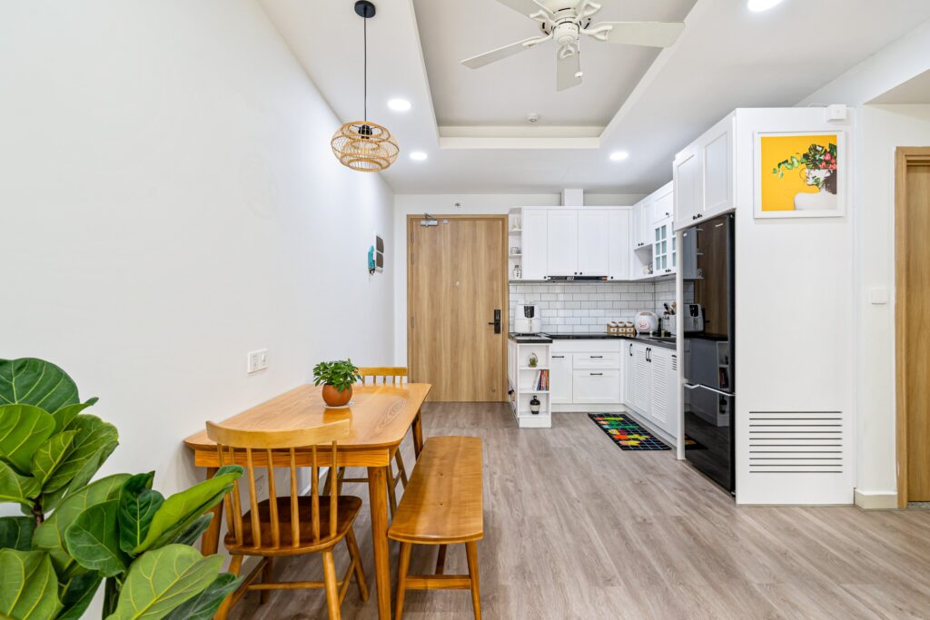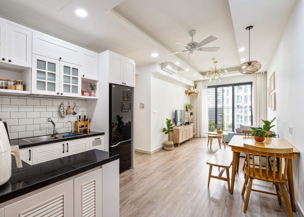 Chất liệu thi công cao cấp, như sàn gỗ, tủ bếp MDF chống ẩm, thiết bị vệ sinh hiện đại và an toàn.