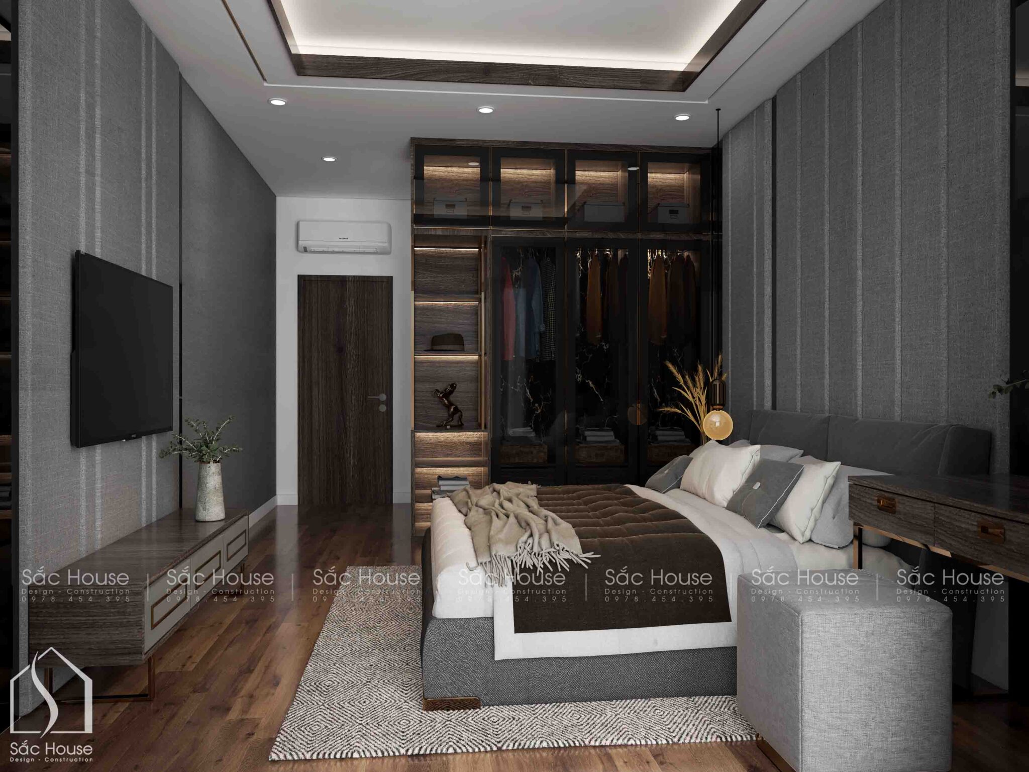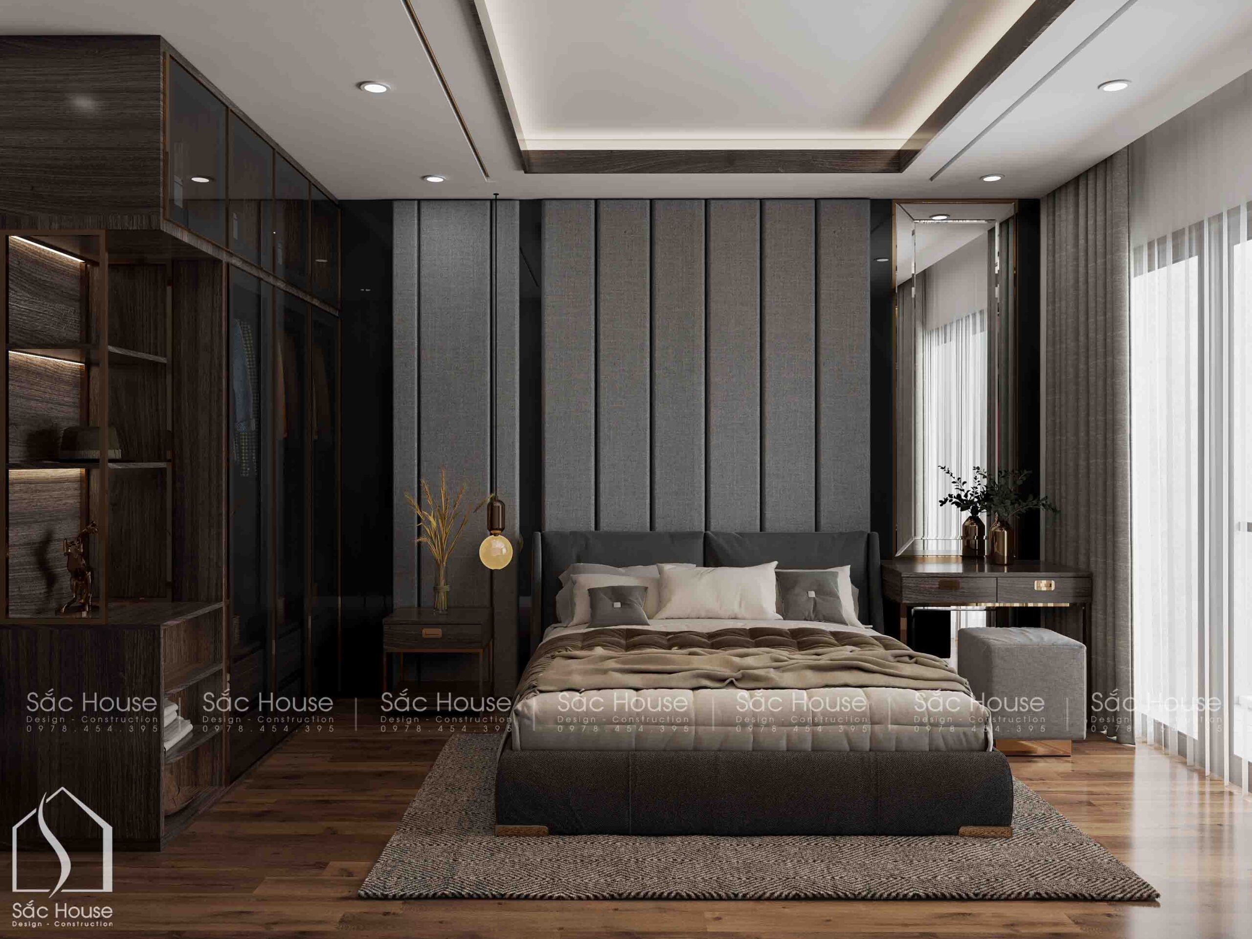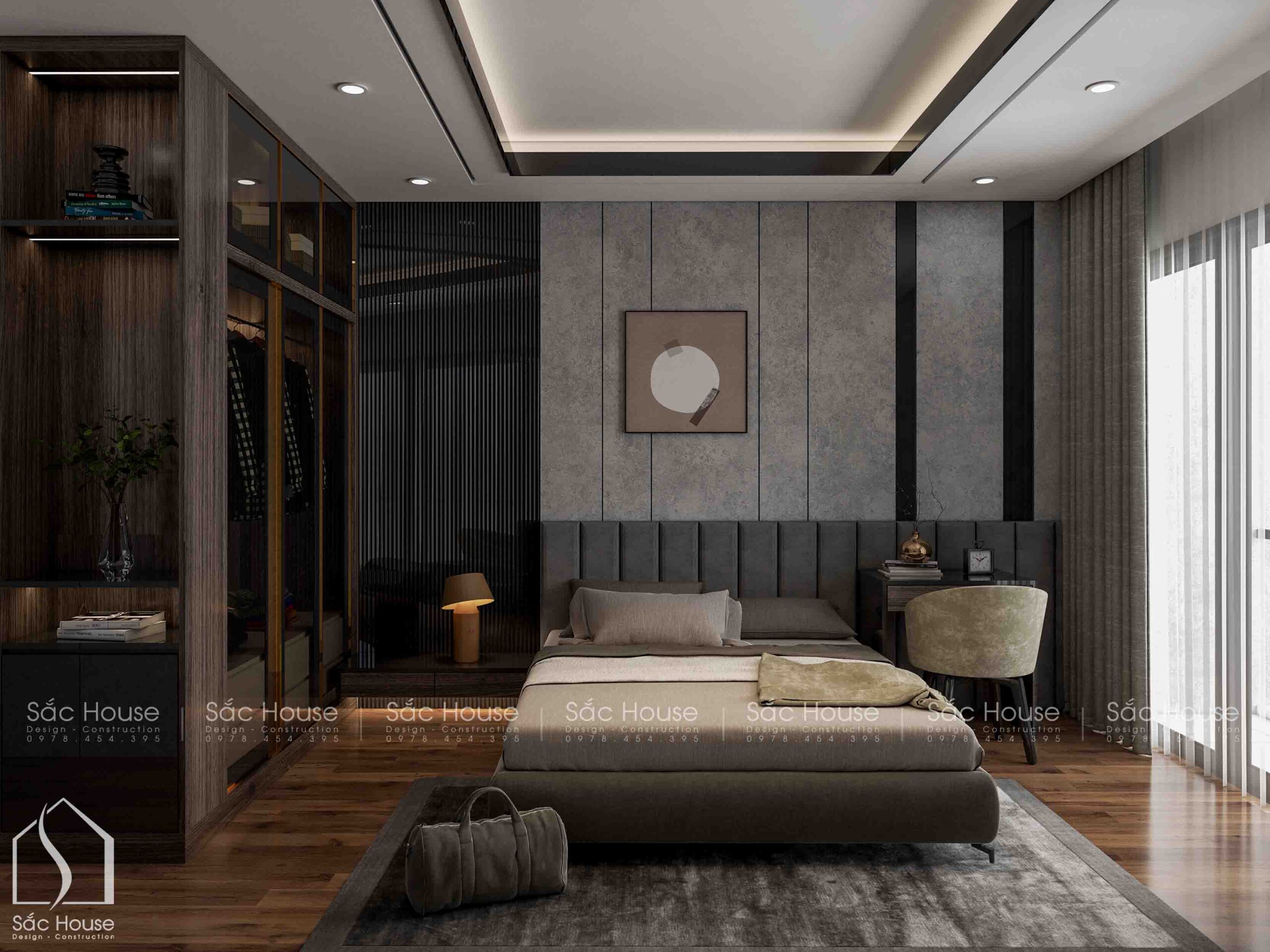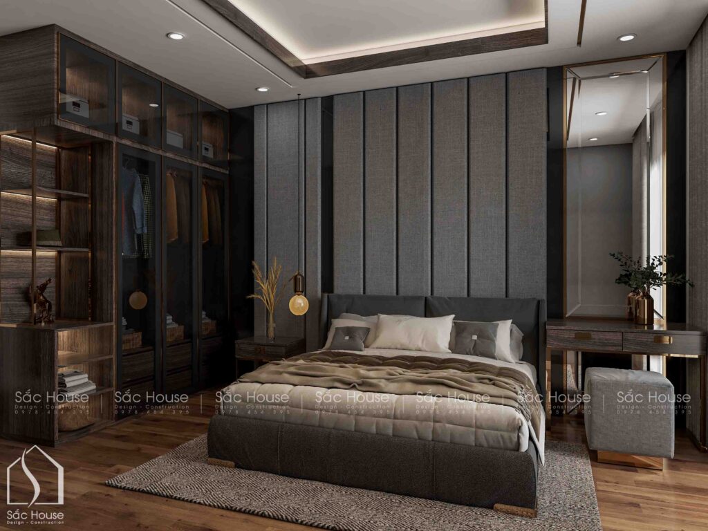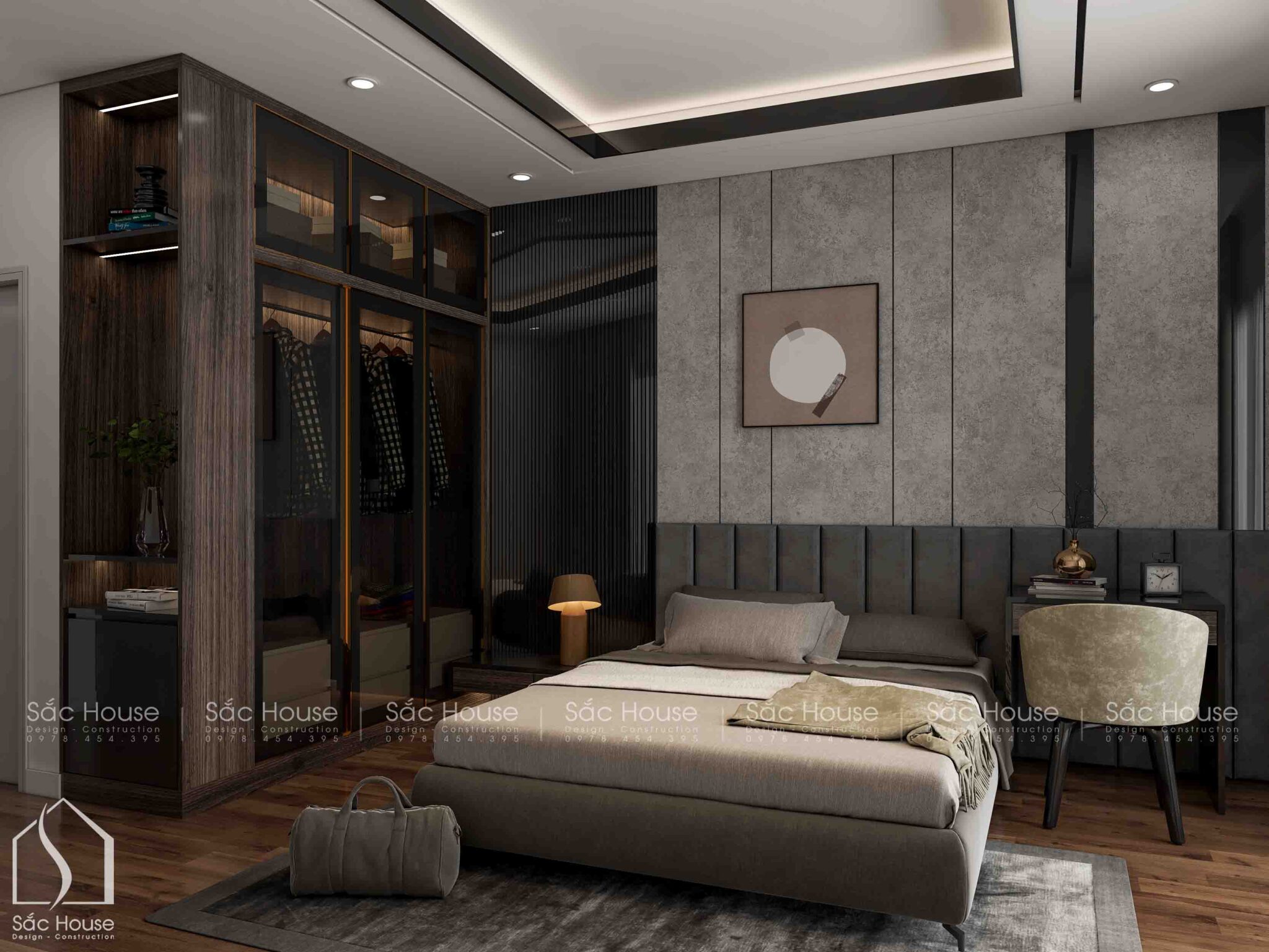 Thiết kế phòng ngủ tối ưu hóa công năng, kết hợp hệ thống đèn âm trần và đèn decor tạo điểm nhấn. Tủ âm tường và không gian lưu trữ thông minh giúp căn phòng luôn gọn gàng, ngăn nắp.