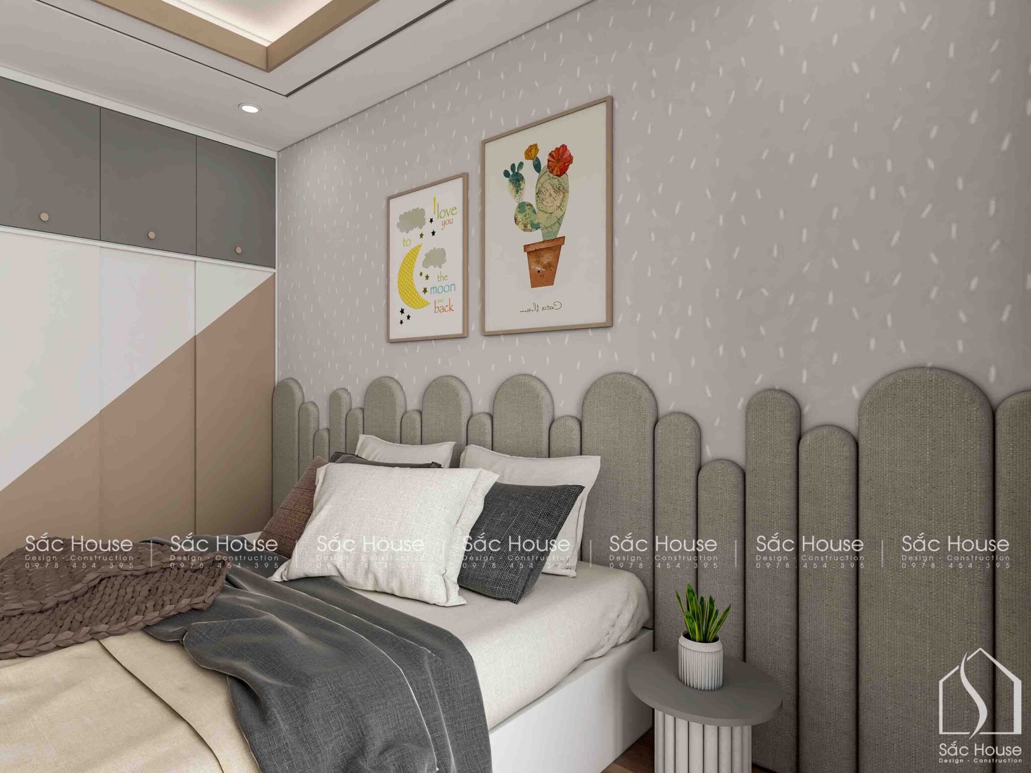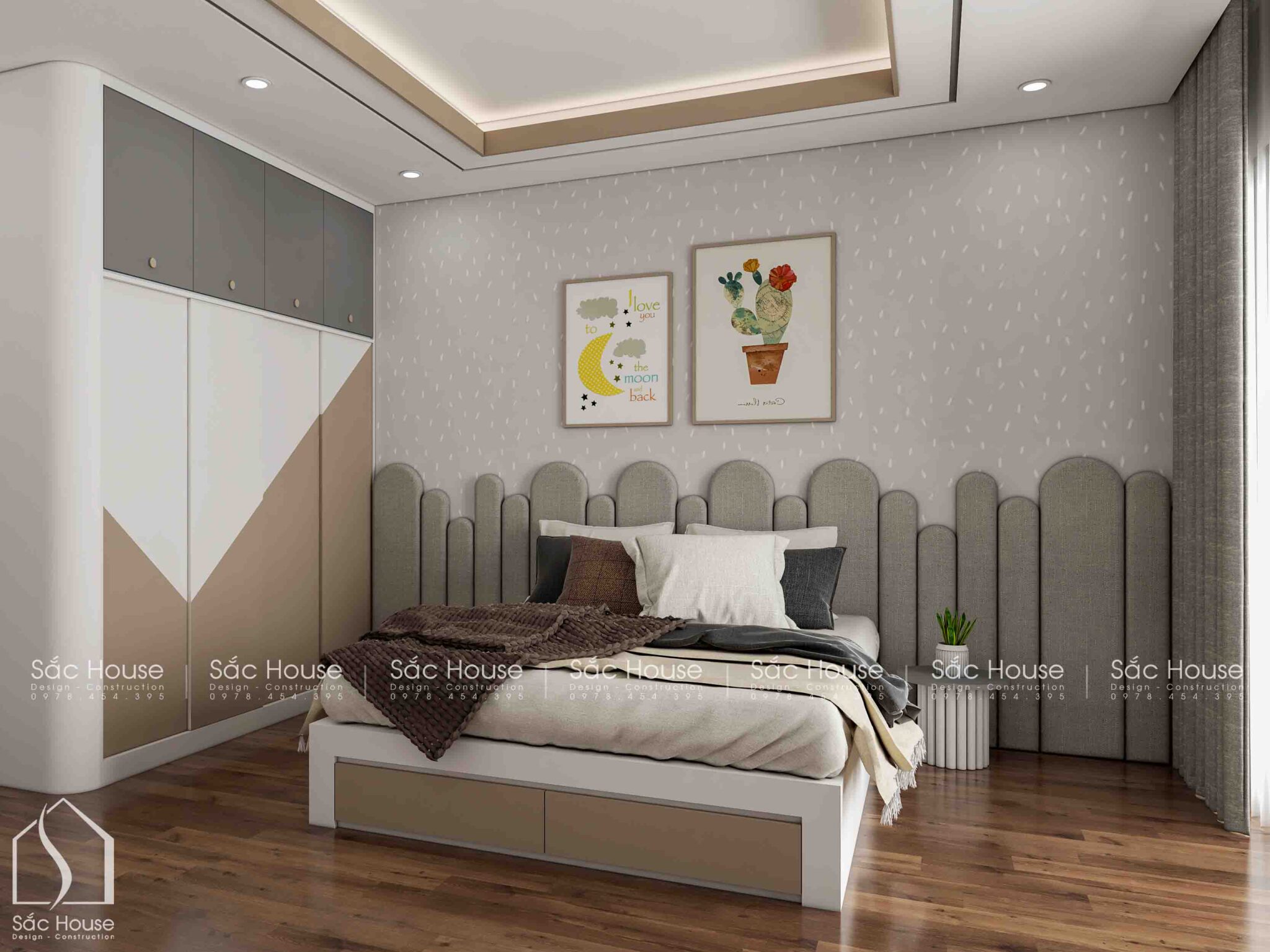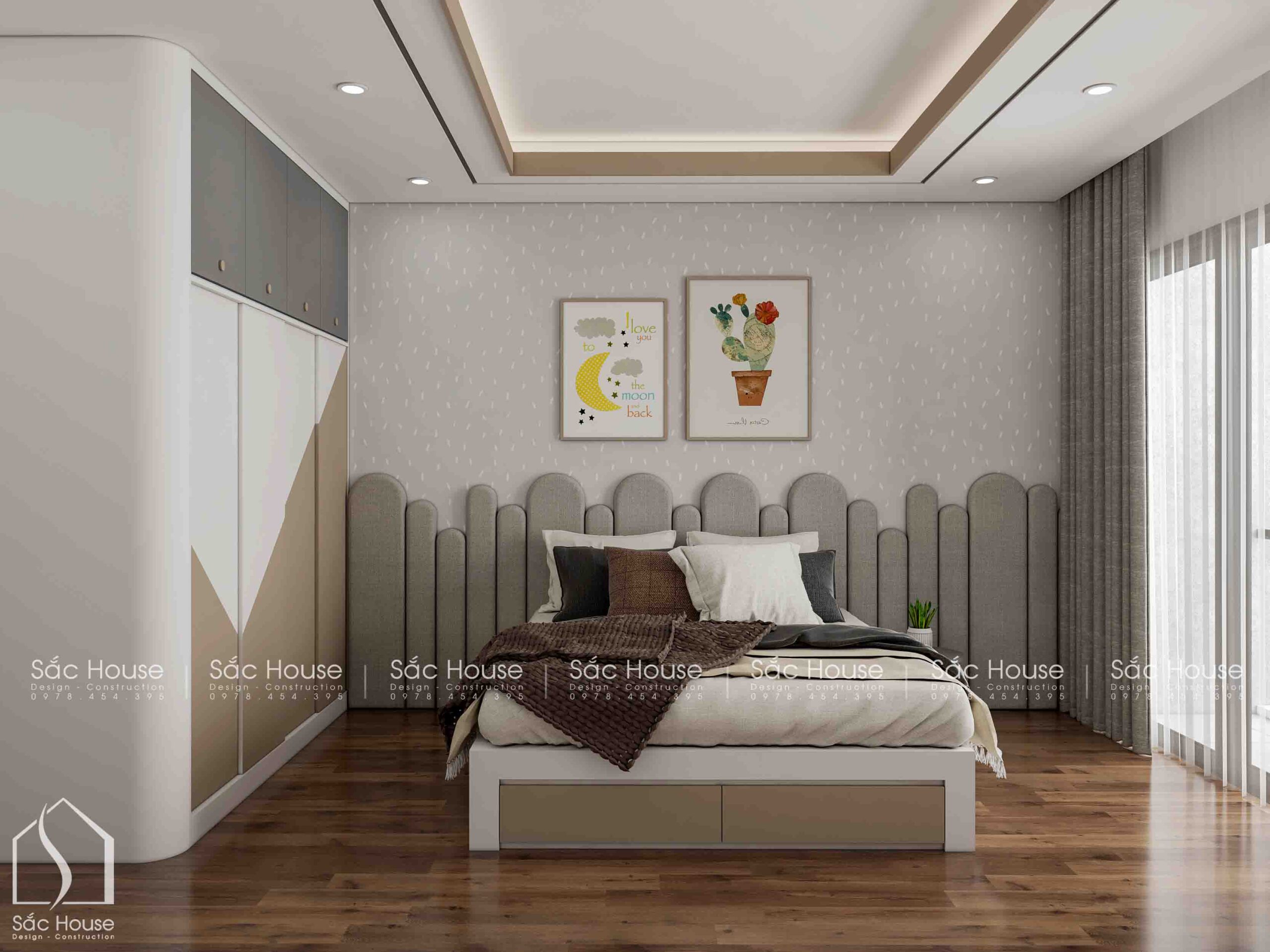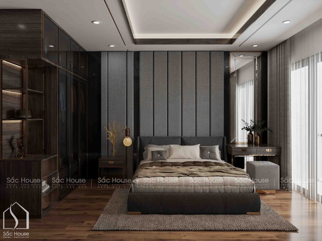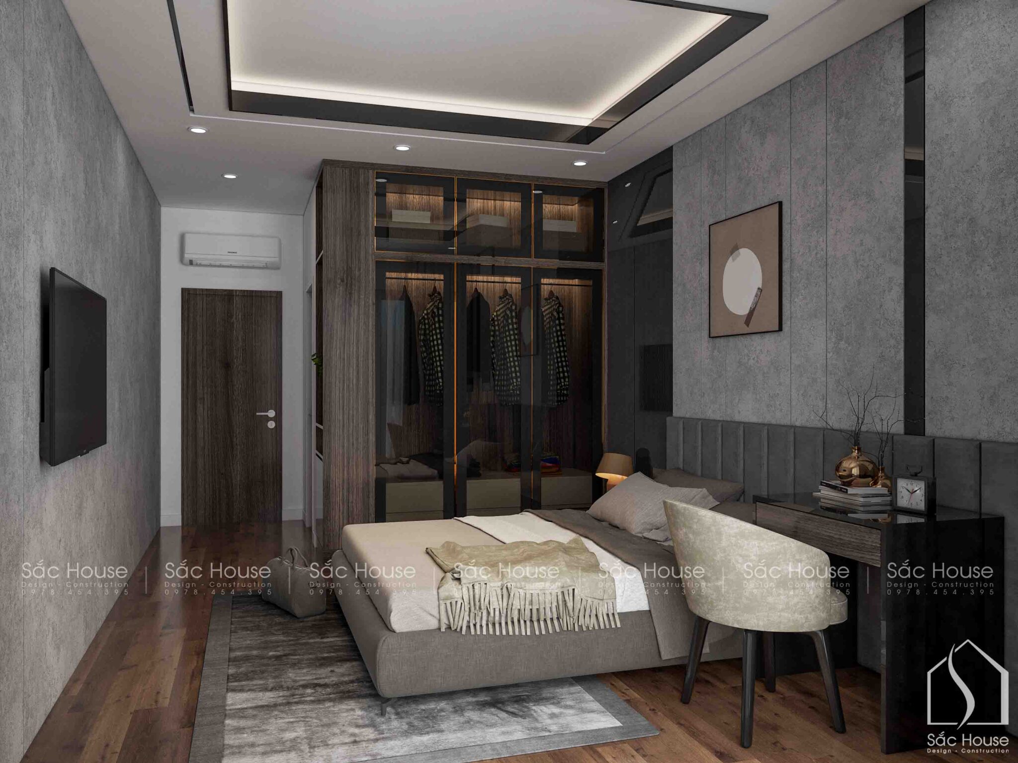Thiết kế phòng ngủ tối ưu hóa công năng, kết hợp hệ thống đèn âm trần và đèn decor tạo điểm nhấn. Tủ âm tường và không gian lưu trữ thông minh giúp căn phòng luôn gọn gàng, ngăn nắp.