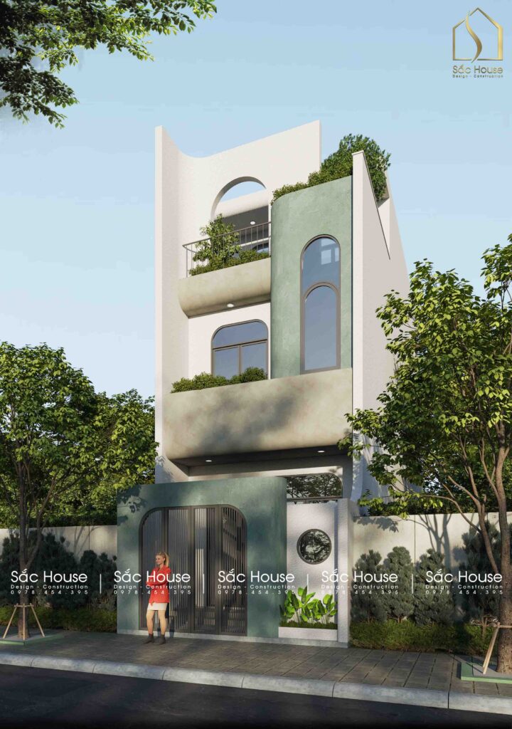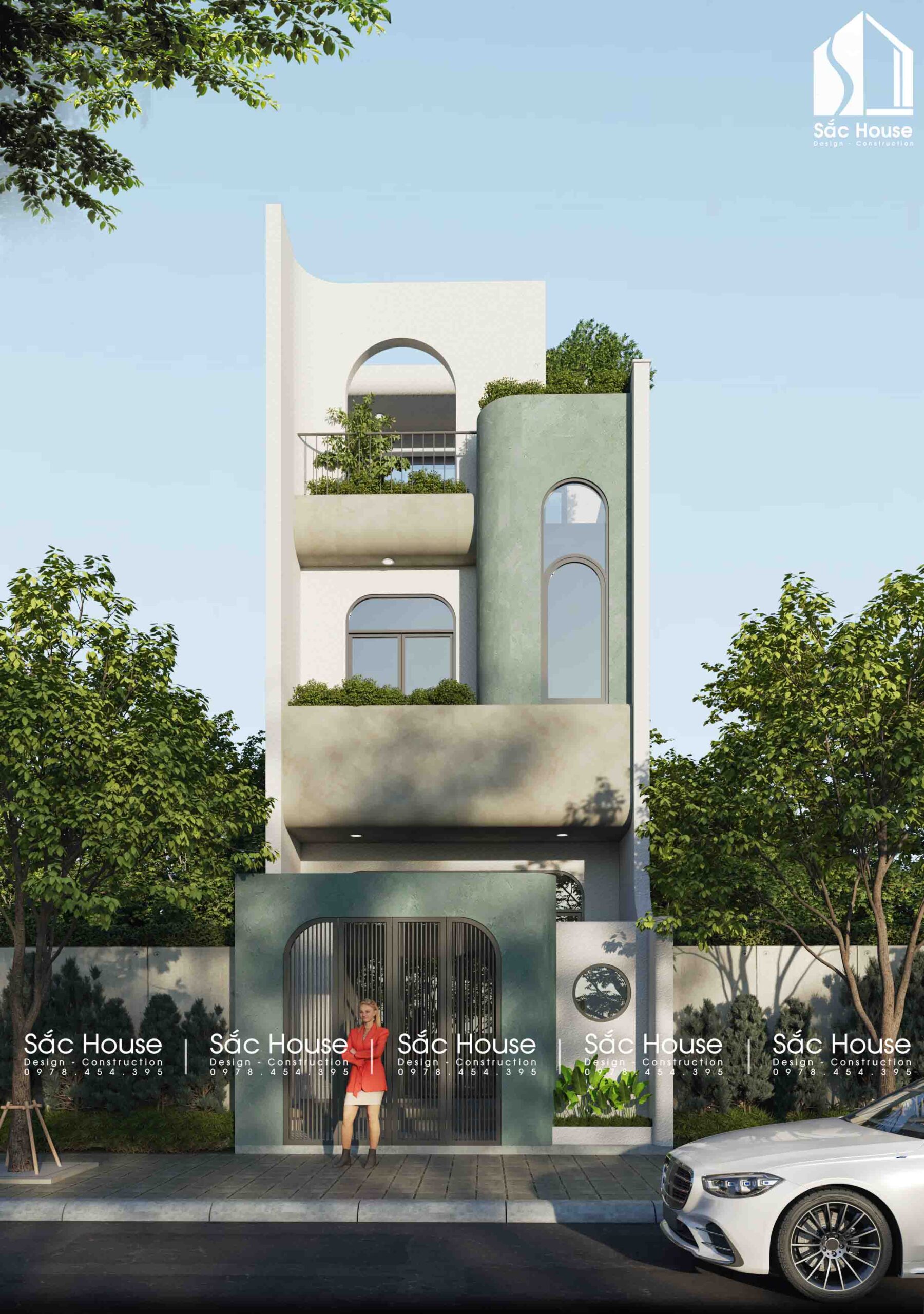 Ngôi nhà sở hữu mặt tiền không cầu kỳ, nhưng lại gây ấn tượng bởi sự hài hòa trong hình khối và màu sắc. Những đường cong mềm mại, đặc biệt là các chi tiết cửa vòm cong và ban công cong, tạo nên một tổng thể nhẹ nhàng, uyển chuyển. Gam màu xanh rêu mát mắt kết hợp cùng tông trắng trung tính tạo cảm giác thanh thoát, gần gũi với thiên nhiên.