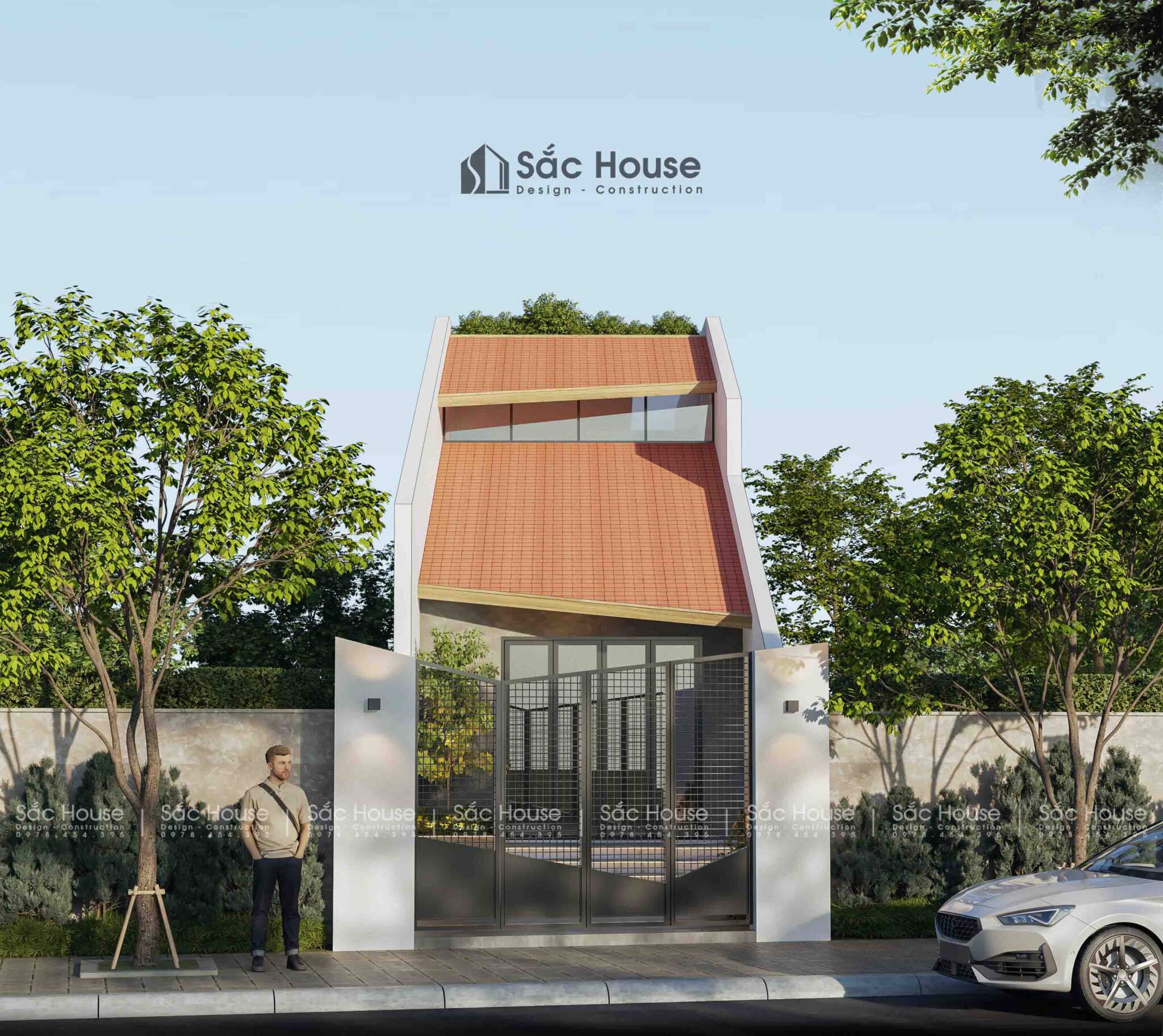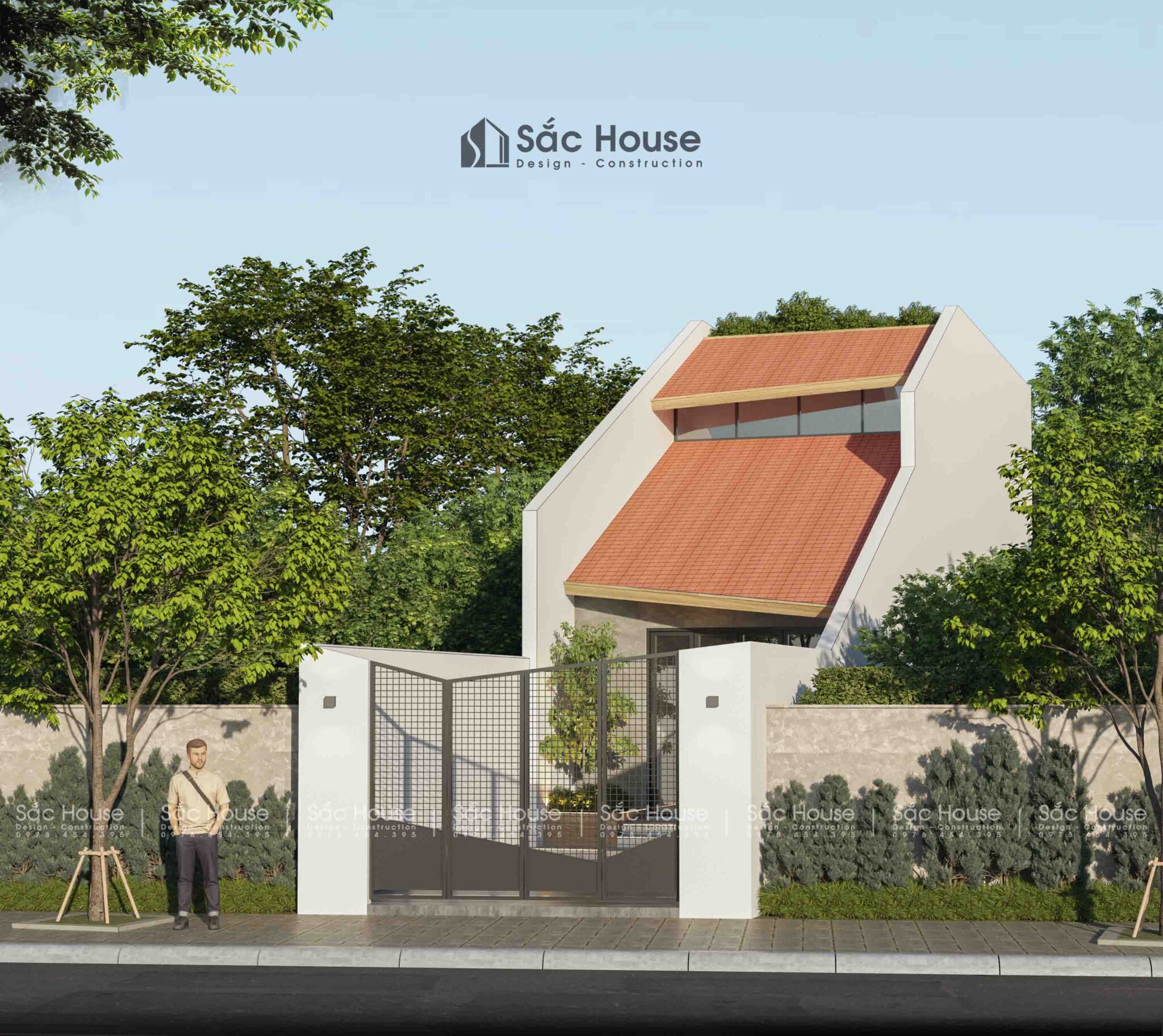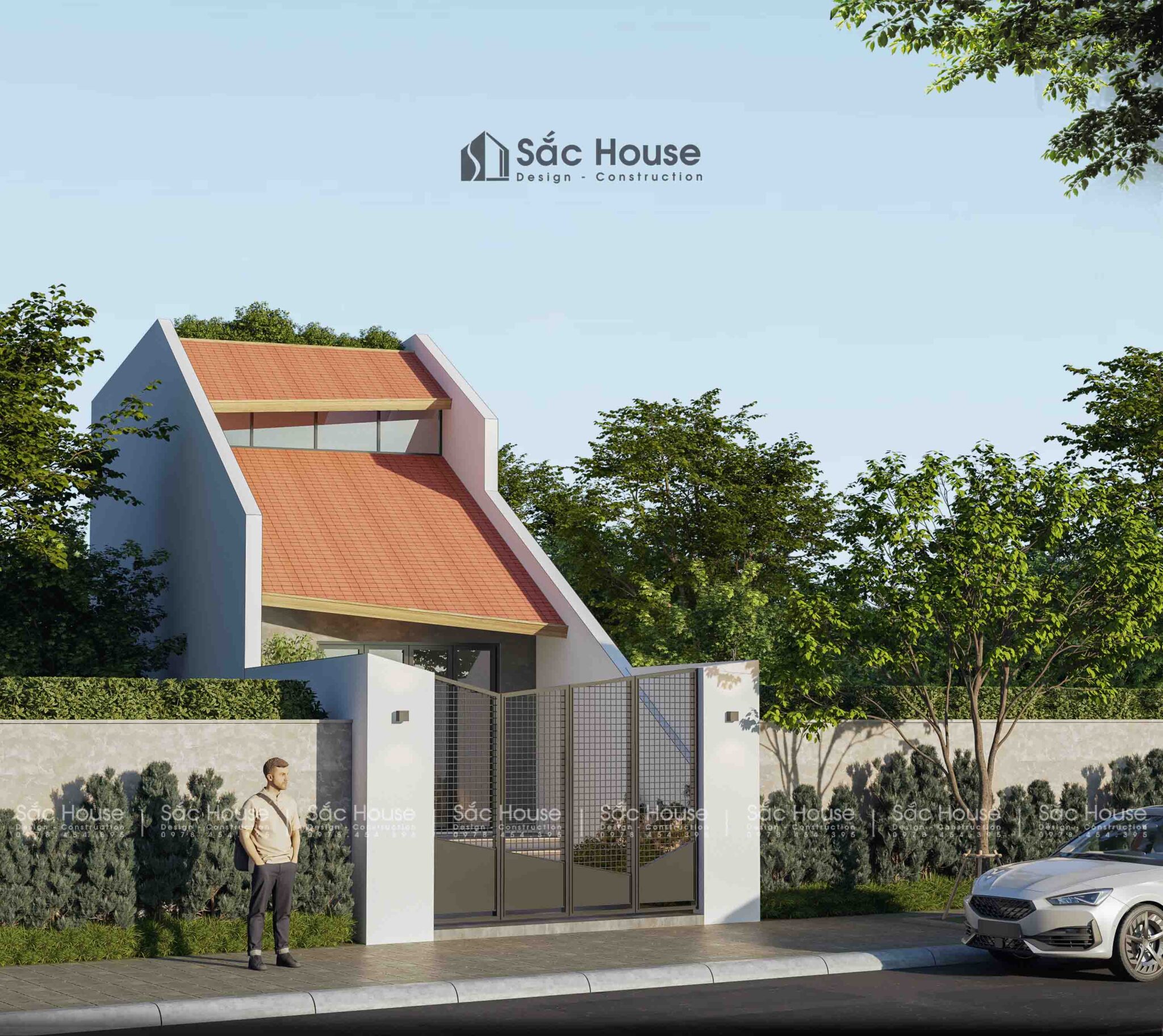 Tổng thể công trình được định hình bởi những đường thẳng dứt khoát, tạo nên vẻ đẹp hiện đại và cá tính. Mặt tiền được xử lý tối giản, sử dụng mảng tường trắng tinh khôi kết hợp cùng mái nghiêng đỏ cam nổi bật, vừa mang hơi thở truyền thống, vừa giữ được tinh thần đương đại.