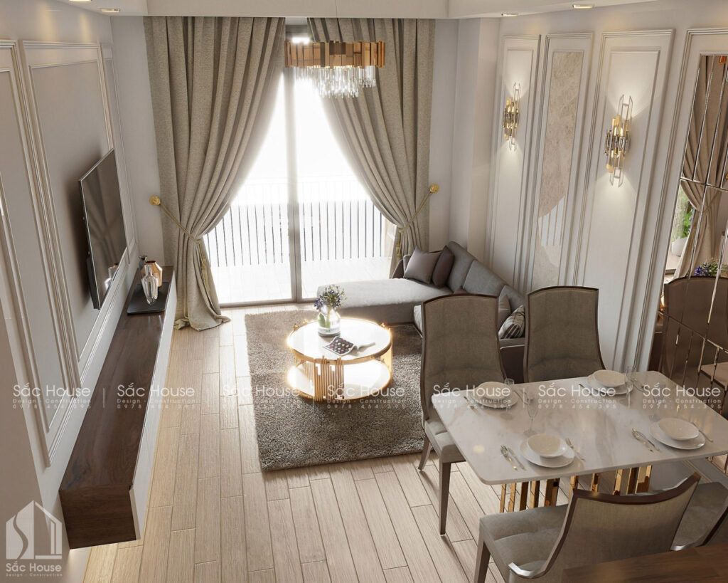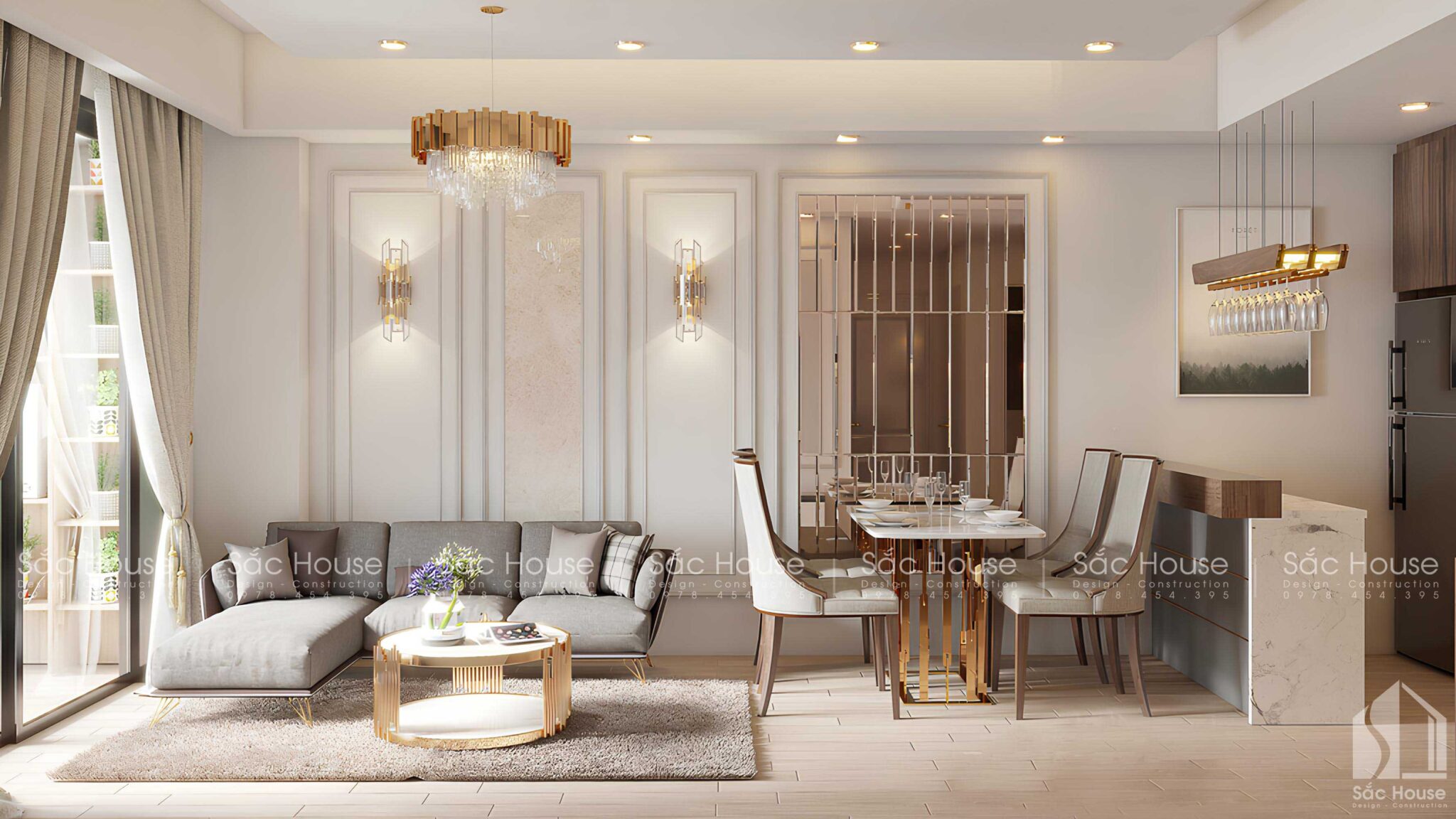 Phòng khách: Sử dụng tone màu be, xám nhạt và vàng đồng nhẹ nhàng để tạo cảm giác ấm áp, sang trọng. Bộ ghế sofa cao cấp kết hợp với bàn trà tròn nhỏ gọn và hệ thống đèn trần mang phong cách châu Âu tinh xảo tạo nên điểm nhấn nổi bật cho không gian.