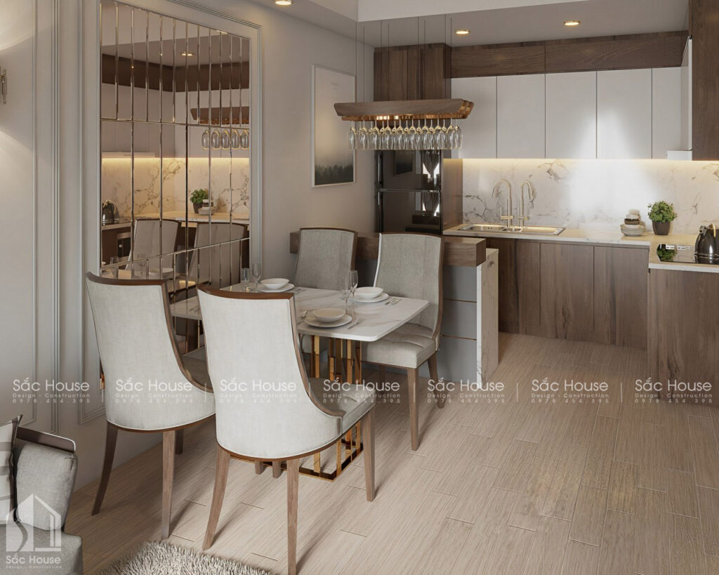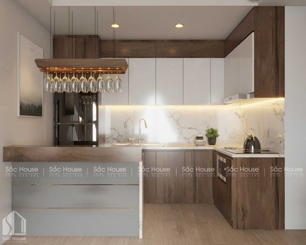Phòng bếp và khu vực ăn uống: Được bố trí liền kề, tạo nên sự thông thoáng và thuận tiện khi sử dụng. Tủ bếp sử dụng chất liệu MDF chống ẩm phủ melamine, kết hợp giữa màu trắng và vân gỗ tạo cảm giác sạch sẽ, hiện đại. Mặt bếp và tường ốp đá marble giúp tăng vẻ sang trọng và dễ dàng vệ sinh.